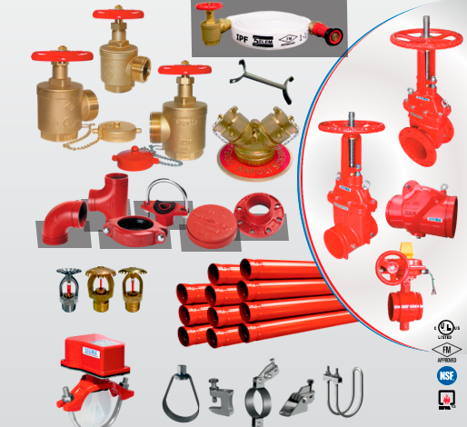 Válvulas, Tuberías, Accesorios ranurados, rociadores, Mangueras y Soportes para redes contra incendio.
